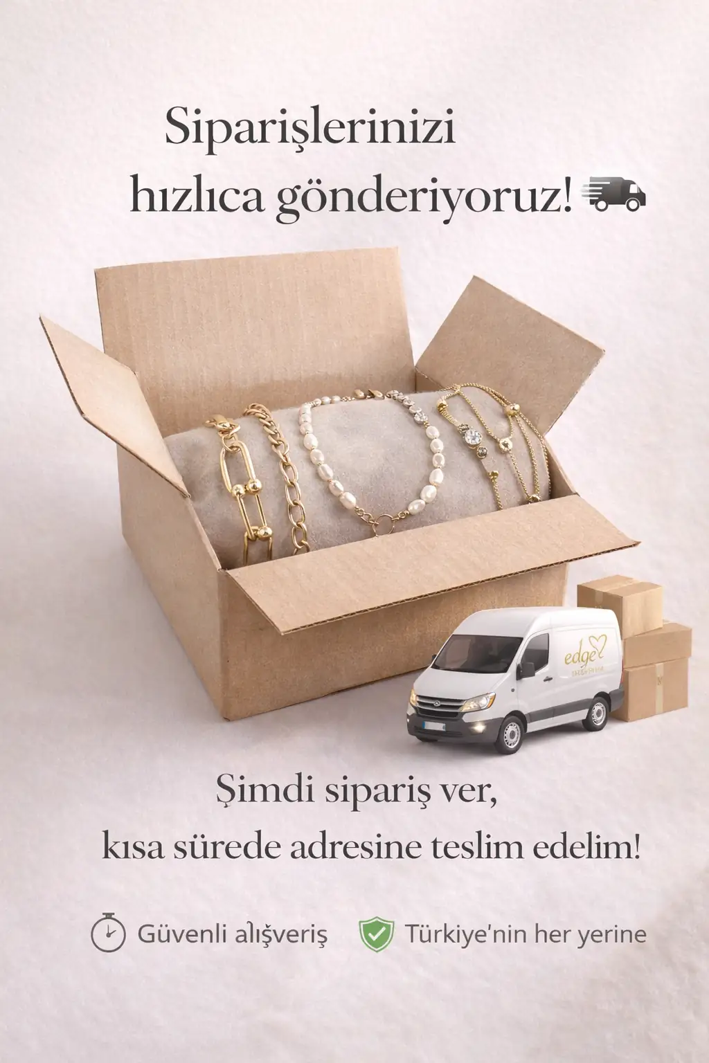 1000 TL üzeri ücretsiz kargo kampanyamız, hem sizin hem de bütçenizin kazanmasını sağlıyor. Kargo ücreti ödemeden kaliteli takılara ulaşmak, sepetinizi stratejik bir şekilde doldurmakla mümkün. Favori ürünlerinizi biriktirin, arkadaşlarınızla toplu sipariş verin veya sevdiklerinize hediyeler alın - nasıl alışveriş yaparsanız yapın, 1000 TL ve üzeri her siparişte kargo bizden!
